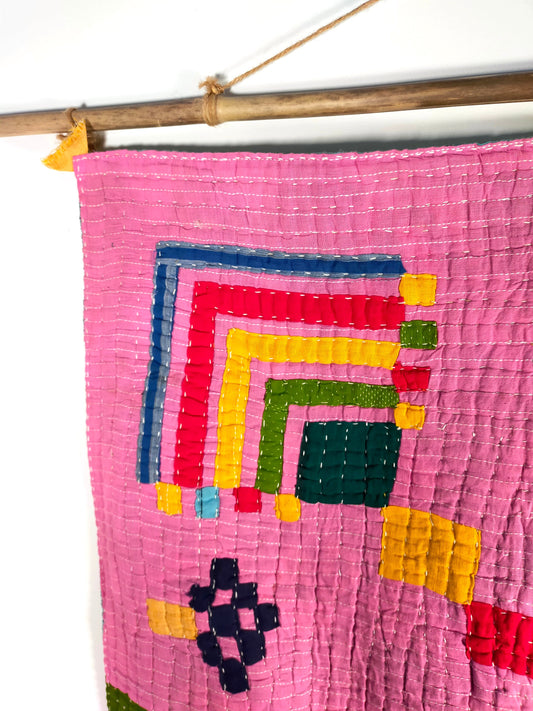 Siddi Tribal Patchwork Kantha Kawandi Kavand Quilted Blanket Made With Recycled Cotton In India - Pink Green And Orange