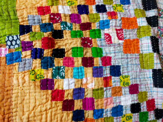 Vintage Patchwork Kantha Blanket/Throw From India Made From Recycled Cotton Saris Hand-Stitched Together.