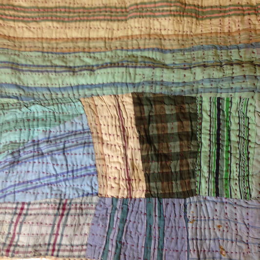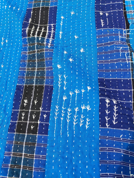 Hand Stitched Indigo Stripe and Checked Lungi Kantha Quilt From Ethically Made In India - Recycled Cotton