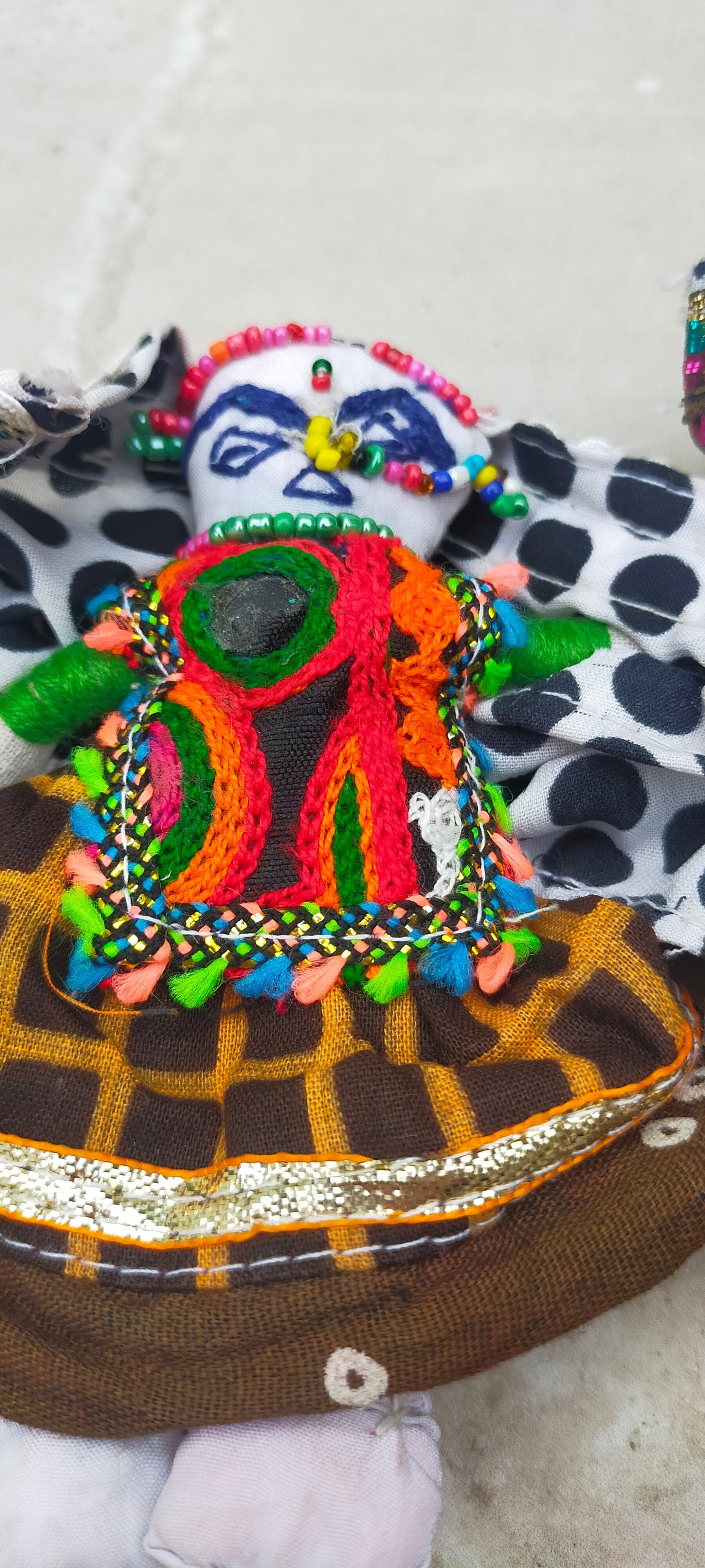 Beautiful and rare handmade dolls from the nomadic Meghwal tribe of Kutch. They are hand-stitched and embroidered. The dolls have loops to hang them with.