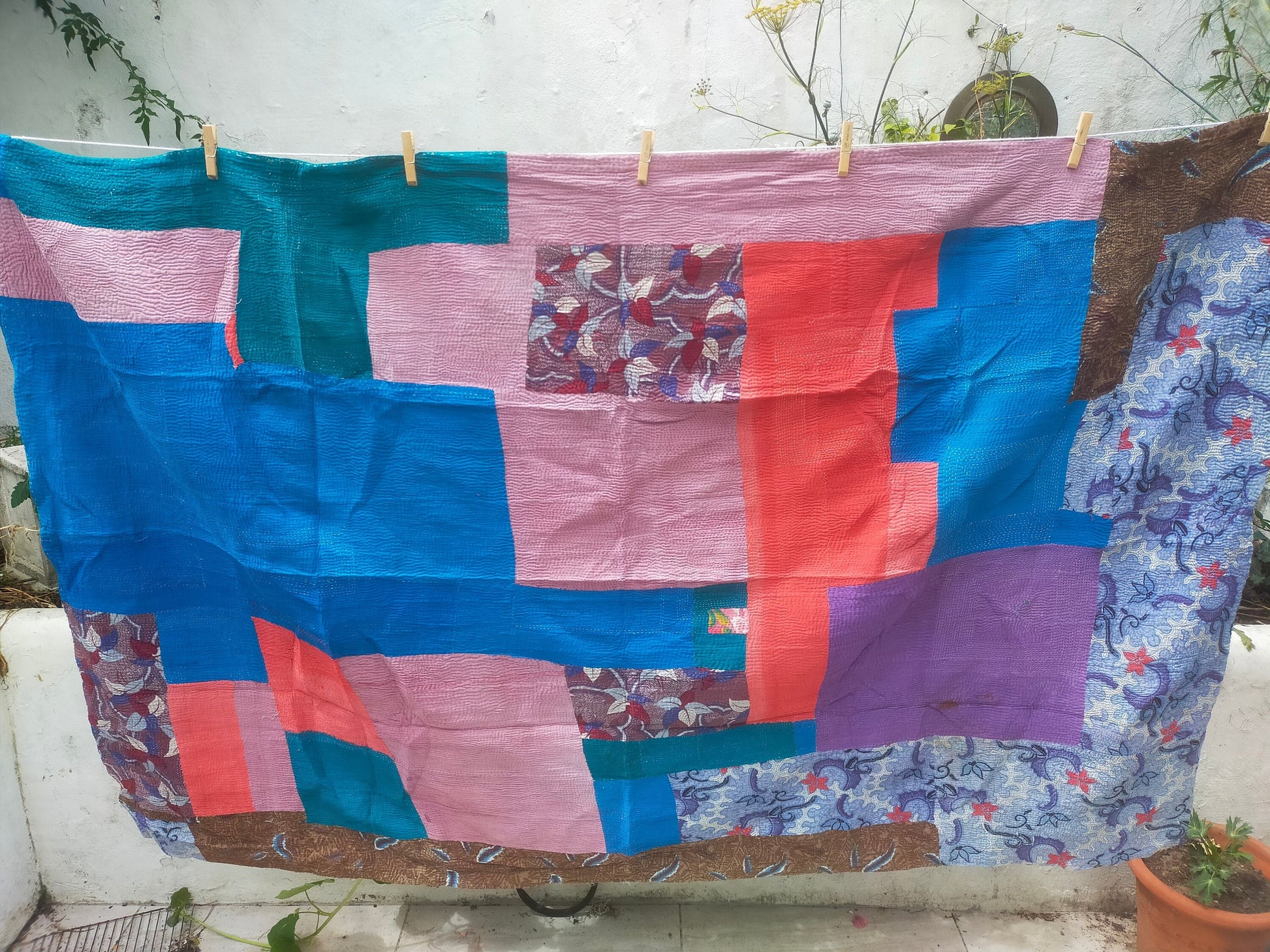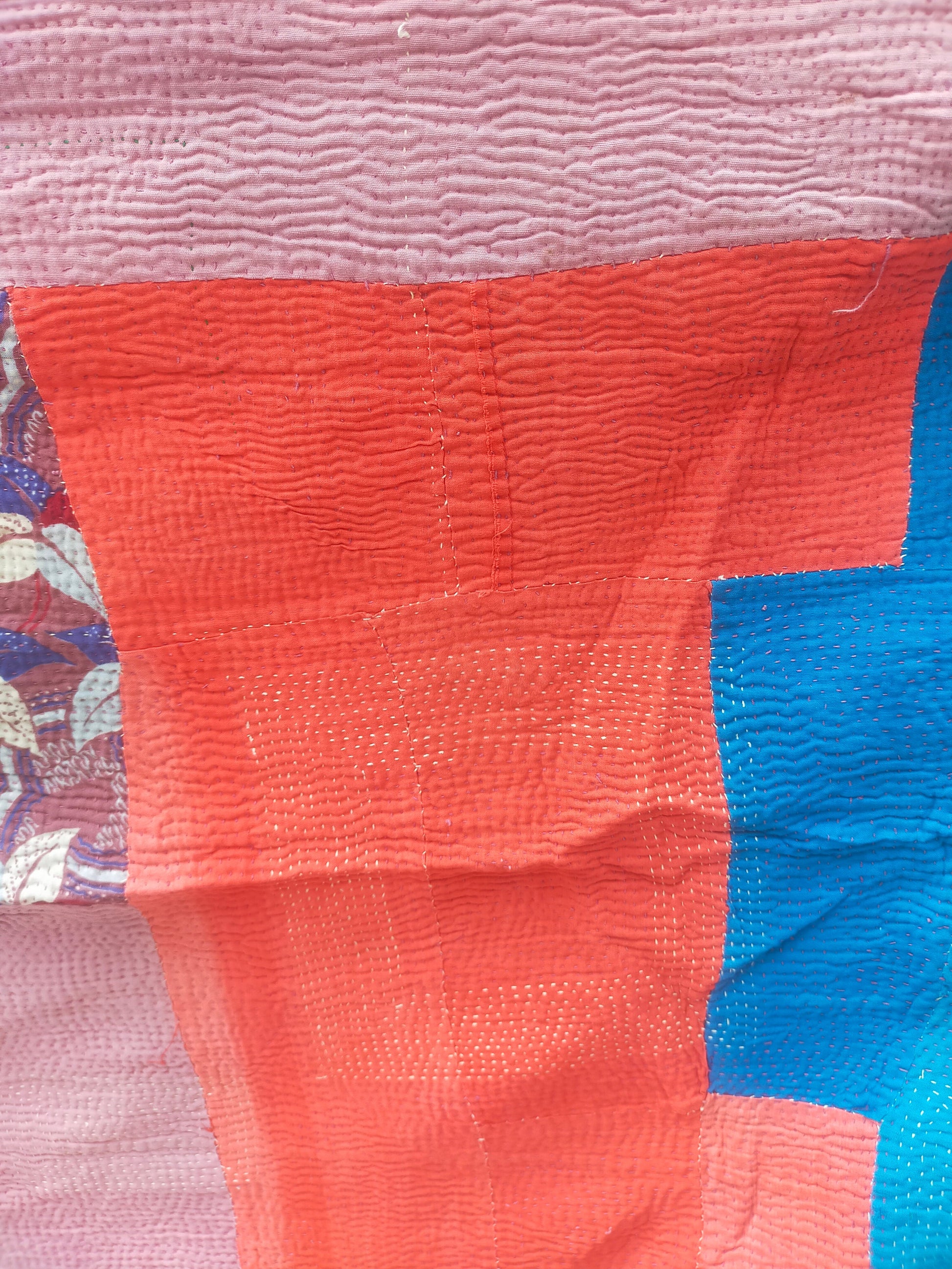 It is made from recycled cotton saris, hand-stitched together with a running stitch. They were originally used to sleep on and not as a blanket. It would be perfect as a throw or bedspread.