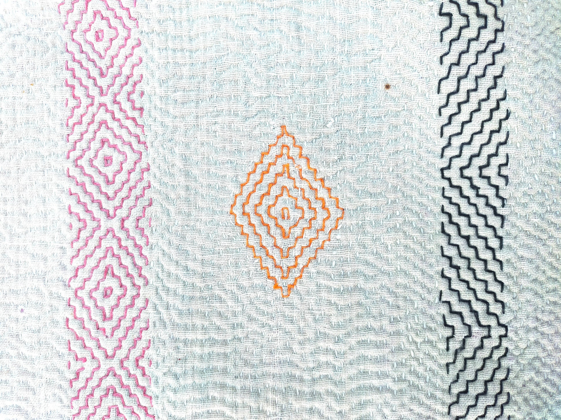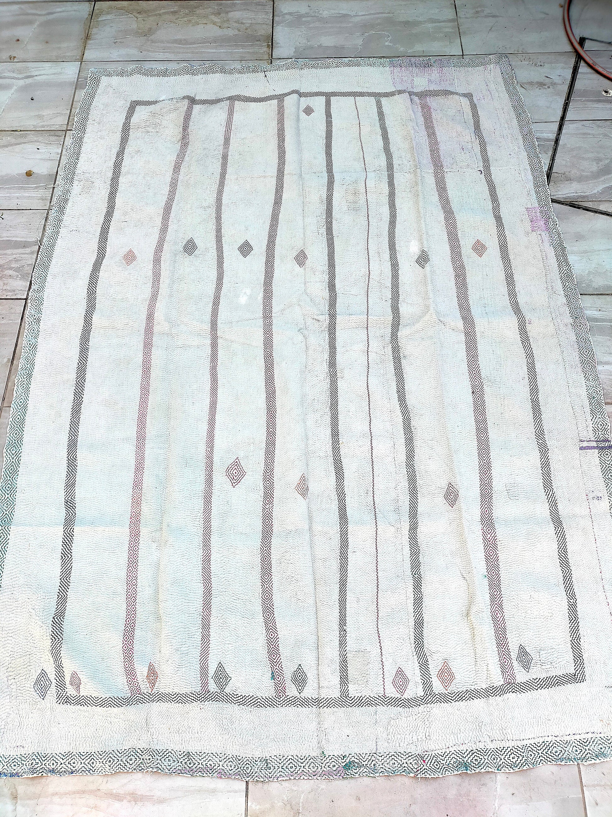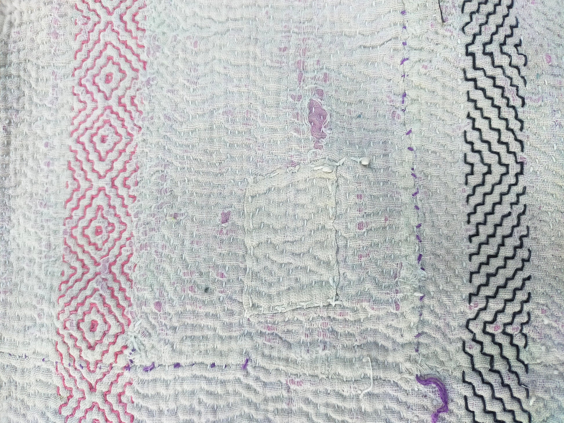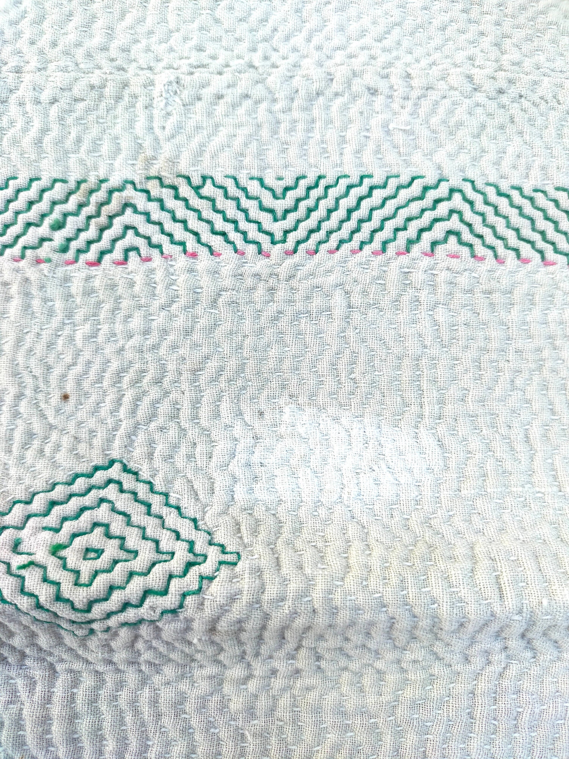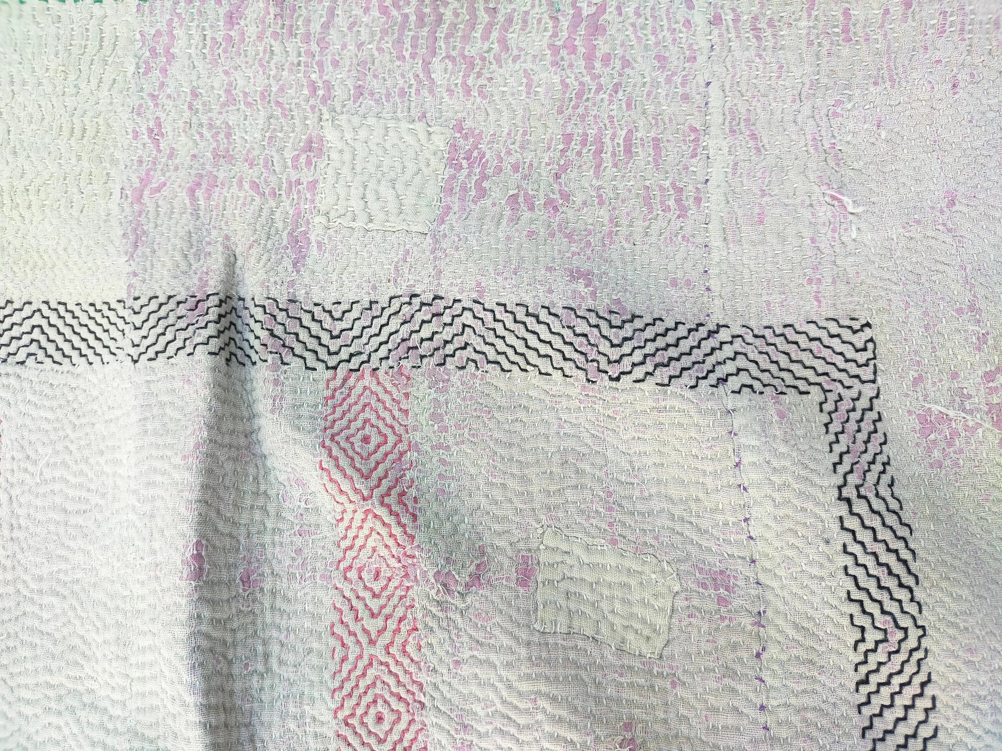 It is made from recycled cotton saris, hand-stitched together with a running stitch. They were originally used to sleep on and not as a blanket. It would be perfect as a throw or bedspread.